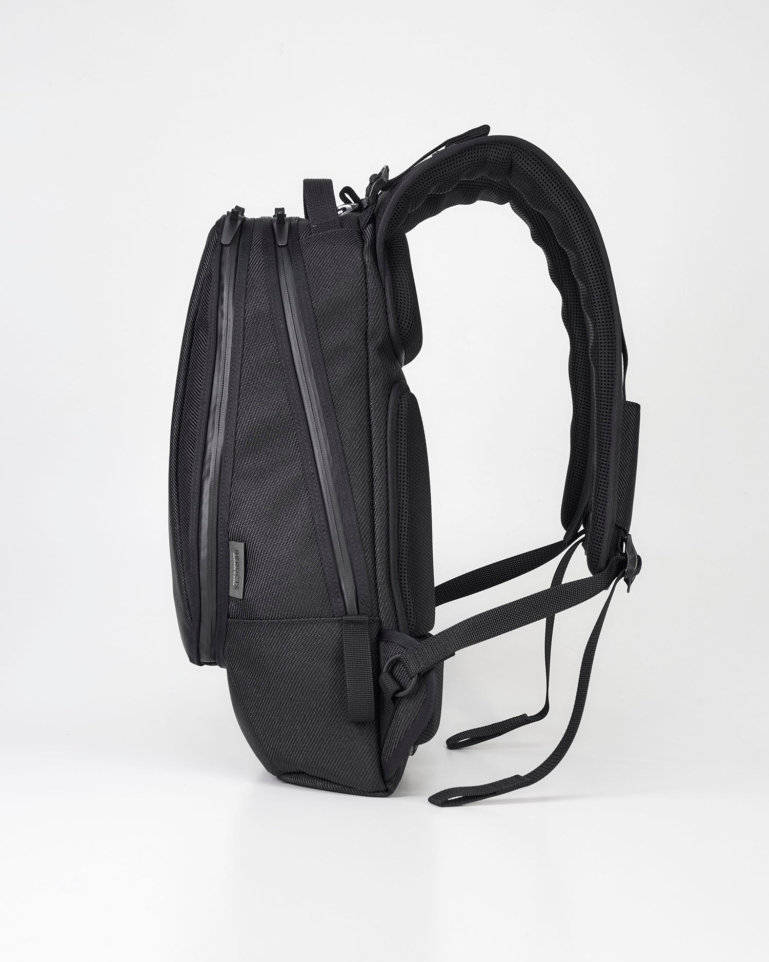 こちらの様な背面凹凸のある仕様の商品は、一般的には加工しやすい硬質樹脂素材で成型されたモノが多いのですが、「CYCLER」で使用しております芯材は、背負い心地と耐久性を重視したベットの様な、軟硬質芯材を組み合わせた「2層構造」で作り上げました。土台部分は、耐久性が高く、緩衝性に優れ、水気にも強い、世界で初めて日本で開発され、様々な業種でもそのクオリティの高さから、使用されている「サンペルカ」を使用し、短期間でヘタれたり、型崩れも起こらず、経年劣化にも強い、高機能芯材を使用し。上部、体に当たる部分の芯材は、クッション性が高く、反発力にも優れ、枕やマットレスにも使用され、食器等を洗う際に使用されるスポンジにも使用される程、こちらも水気に強い日本製「ポリウレタンフォーム」芯材を使用しております。