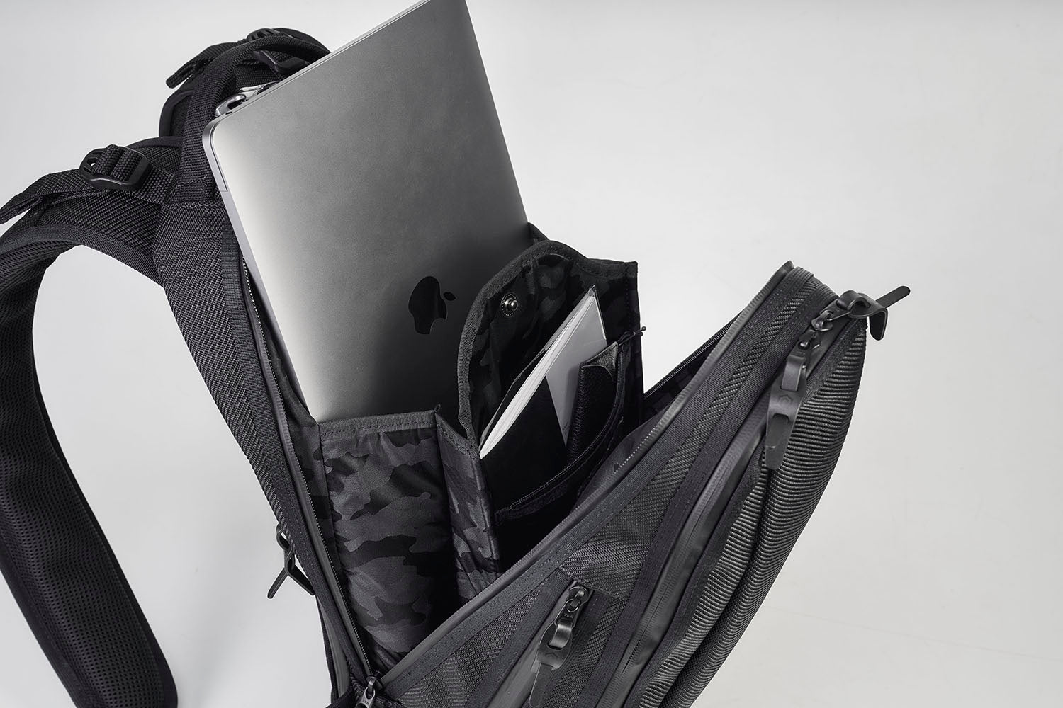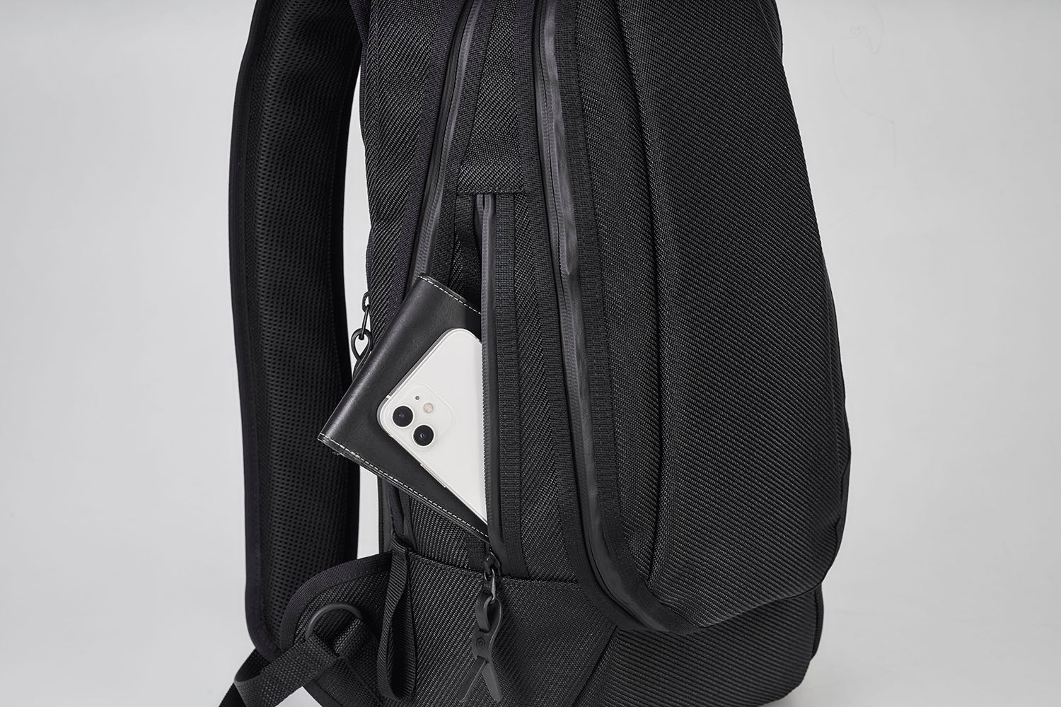 背面右側下部には、長財布やパスポートなどの貴重品をご収納頂ける容量の深い ファスナーポケットを配置しました。バックパックを背負った状態の密着により、盗難等を防止します様、外側からは収納物を取り出ししずらい仕様になっております。
