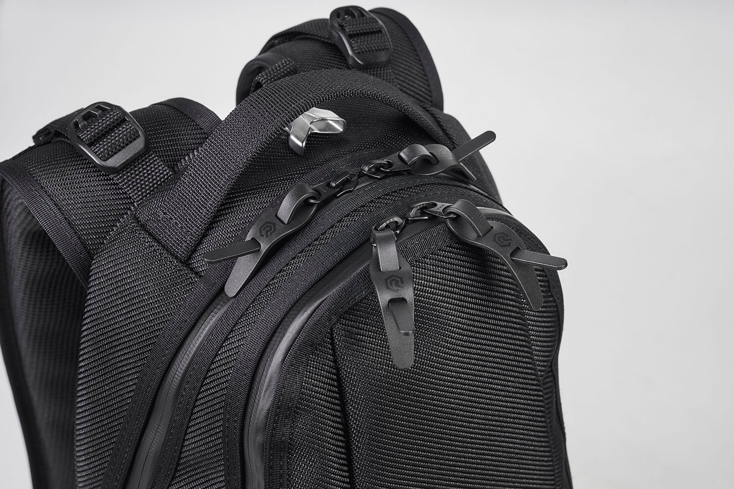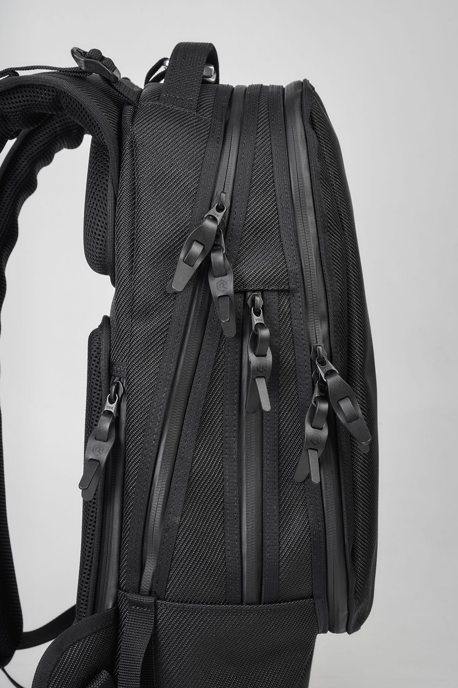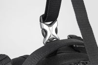 ヘルメットや、ウェアー収納時に、前ポケットと本体(天マチ部分)を止める際に仕様するジョイントは、強度性が高く、軽量で、美しい曲線美が特徴のデザイン性に優れた「アルミ製ジョイント」を使用しております。 ショルダーベルト付け根部分のコキは、独特のデザインながらも、引っかからない様、コンパクトサイズで 作られたプラスティック製コキを使用しております。 こちらのパーツは、アメリカ”Duraflex”社製のパーツを使用しております。同社は、パーツメーカーで、世界的有名アウトドアブランドやスポーツブランドから、優れた耐久性や強度性、機能性 を認められ、世界のパーツ関連、トップシェアのブランドであります。 また、独自の優れたデザイン性も特徴で、近年ファッション業界からも注目されております。