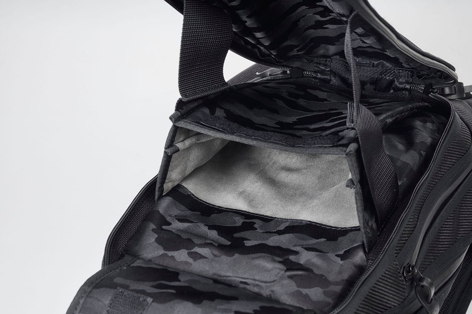 前ポケット内装は、独特の陰影感が特徴で、上品な大人のカジュアル感ある 日本製”カモフラ柄ジャガード織生地”を採用しております。 冠せ部分には、鍵や小物等をご収納頂けるファスナーポケットを配置しております。 (※ヘルメットを収納された後、取り出す際に冠せ部分に引っかかる事がありますので、取り出しの際には、ご注意下さい。)